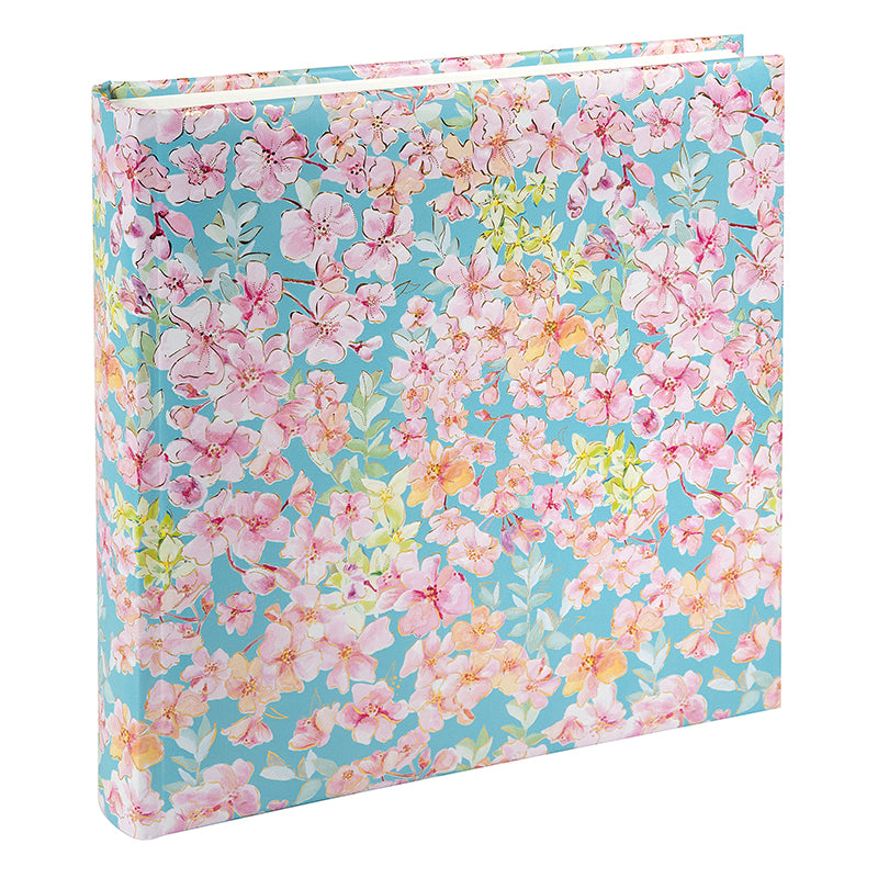 Slip-in album for 200 photos 10x15 cm, pastel blue cover with spring blossoms, high-quality embossing and relief, memo fields for labeling, art print material