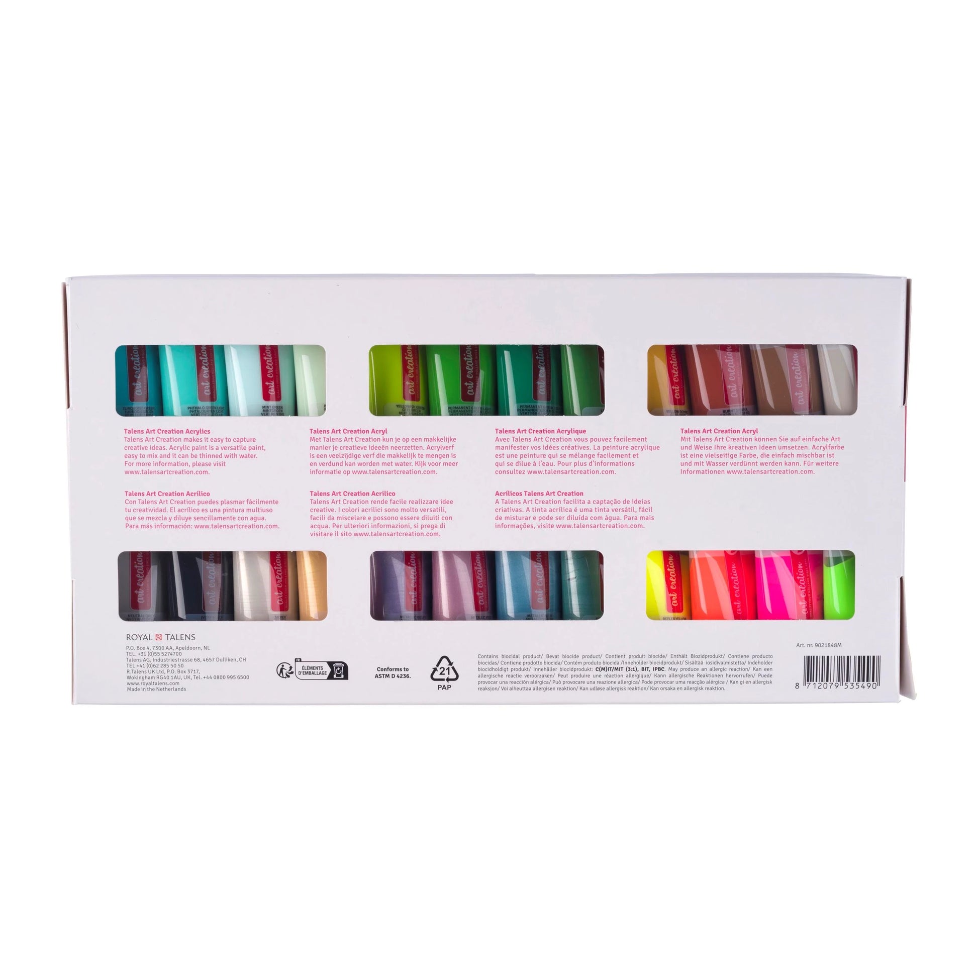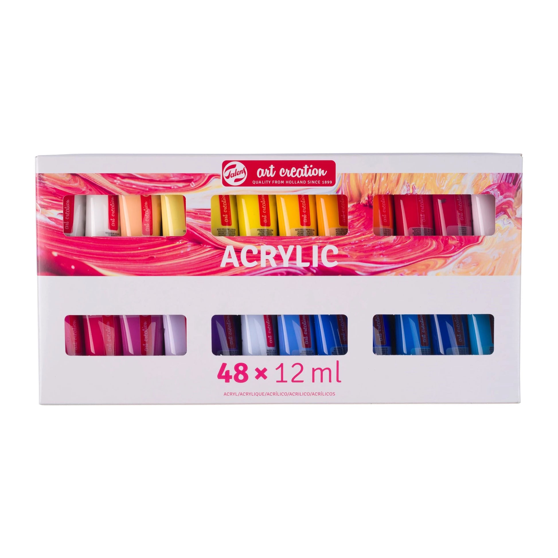 This acrylic colour set of 48 x 12 ml tubes offers a great variety of colours to create various paintings with. Save time on mixing custom colours with the extensive colour selection of this set! Because of their convenient size, these tubes are ideal to have in your studio or to take with you while you travel. Talens Art Creation also offers sets of 6, 8, 12, 24 and 36 tubes, and a starter set with everything you need to begin your acrylic painting journey.