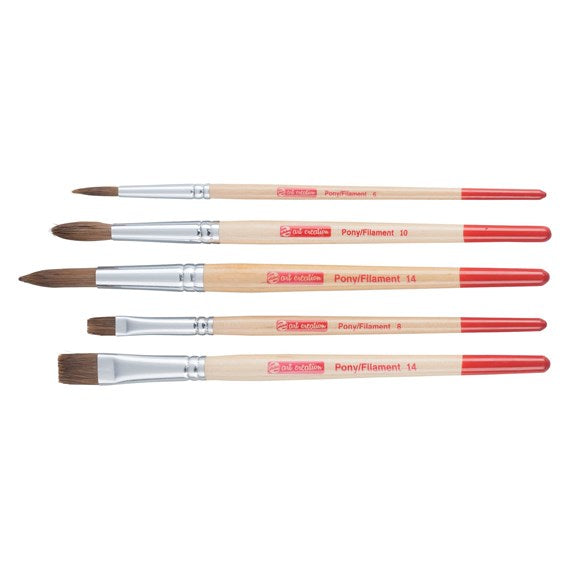 This brush set of pony/polyester is suitable for water colour and contains the following types and sizes: Round brushes in sizes 6, 10 and 14, Flat brushes in sizes 8 and 14.
