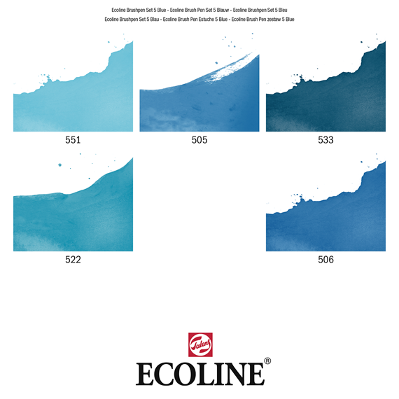 Talens Ecoline Brush Pen Set of 5 - Blue is based on dyes and Gum arabic. The colours of Talens Ecoline are astonishingly bright and brilliant. If you wish, you can easily decrease the colour intensity through thinning with water or with the Brush Pen blender (separately available). Store the original works of art in a portfolio for optimal colour retention.The concentrated formula of the Talens Ecoline in the Brush Pens ensures for a seamless transition with the Talens Ecoline from the bottles. Using the special Brush Pen blender, colours can be mixed or subdued, and some wonderful wash effects and colour transitions can be created. Forgotten to put the cap back on? A dried brush tip can be easily saved by moistering it with some water. Contents: 5 Brush Pens (551 sky blue light - 505 ultramarine light - 533 indigo - 522 turquoise blue - 505 ultramarine deep)
