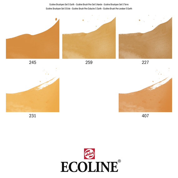 Talens Ecoline Brush Pen Set of 5 - Earth is based on dyes and Gum arabic. The colours of Talens Ecoline are astonishingly bright and brilliant. If you wish, you can easily decrease the colour intensity through thinning with water or with the Brush Pen blender (separately available). Store the original works of art in a portfolio for optimal colour retention.The concentrated formula of the Talens Ecoline in the Brush Pens ensures for a seamless transition with the Talens Ecoline from the bottles. Using the special Brush Pen blender, colours can be mixed or subdued, and some wonderful wash effects and colour transitions can be created. Forgotten to put the cap back on? A dried brush tip can be easily saved by moistering it with some water. Contents: 5 Brush Pens (245 saffron yellow - 259 sand yellow - 227 yellow ochre - 231 gold ochre - 407 deep ochre)