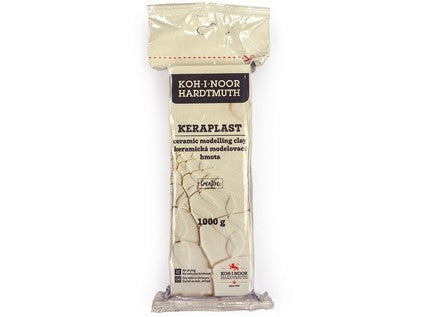 Keraplast clay is air-hardened modelling clay that may not be remodelled again after hardening. Prior to modelling, knead the clay thoroughly, and surface finish the product with moistened fingers and let it dry at room temperature. The clay may be used to model figures, shapes, decorations, ornaments, and more. It may be coloured and ornamented after hardening. Unused clay must be perfectly packed in a PE bag, not HDPE bag. The clay is suitable for children, available packaging in vacuum shaped aluminium foil is à 300 g and 1000 g.