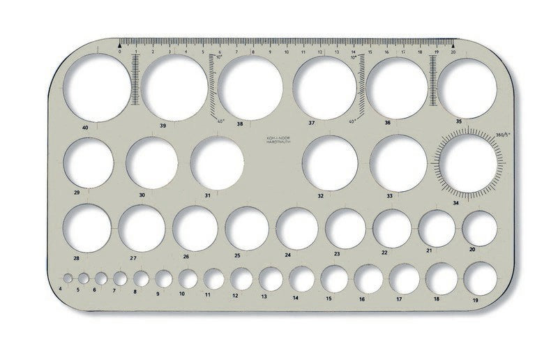 Circle template made from smoky transparent polystyrene. Designed for drawing of circles of diameter 4-40 mm in 1 mm step using a sharpened pencil, mechanical pencil, propelling pencil, or technical pens. All round holes are identified with printed number representing the diameter and axis cross. In addition, the following is printed on the template: 200 mm length scale, protractor scale 0-360° (in 5° steps), two protractor scales 0-40° (in 1° steps), and the scale for parallel lines.