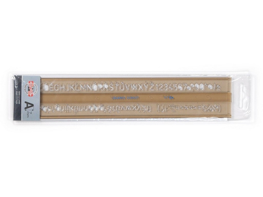 Letter template made from smoky transparent polystyrene. Designed for working with 0,7 mm technical pen. Contains characters of lower case and upper case alphabet, digits, and mathematical symbols. All characters are 7 mm high and in upright face