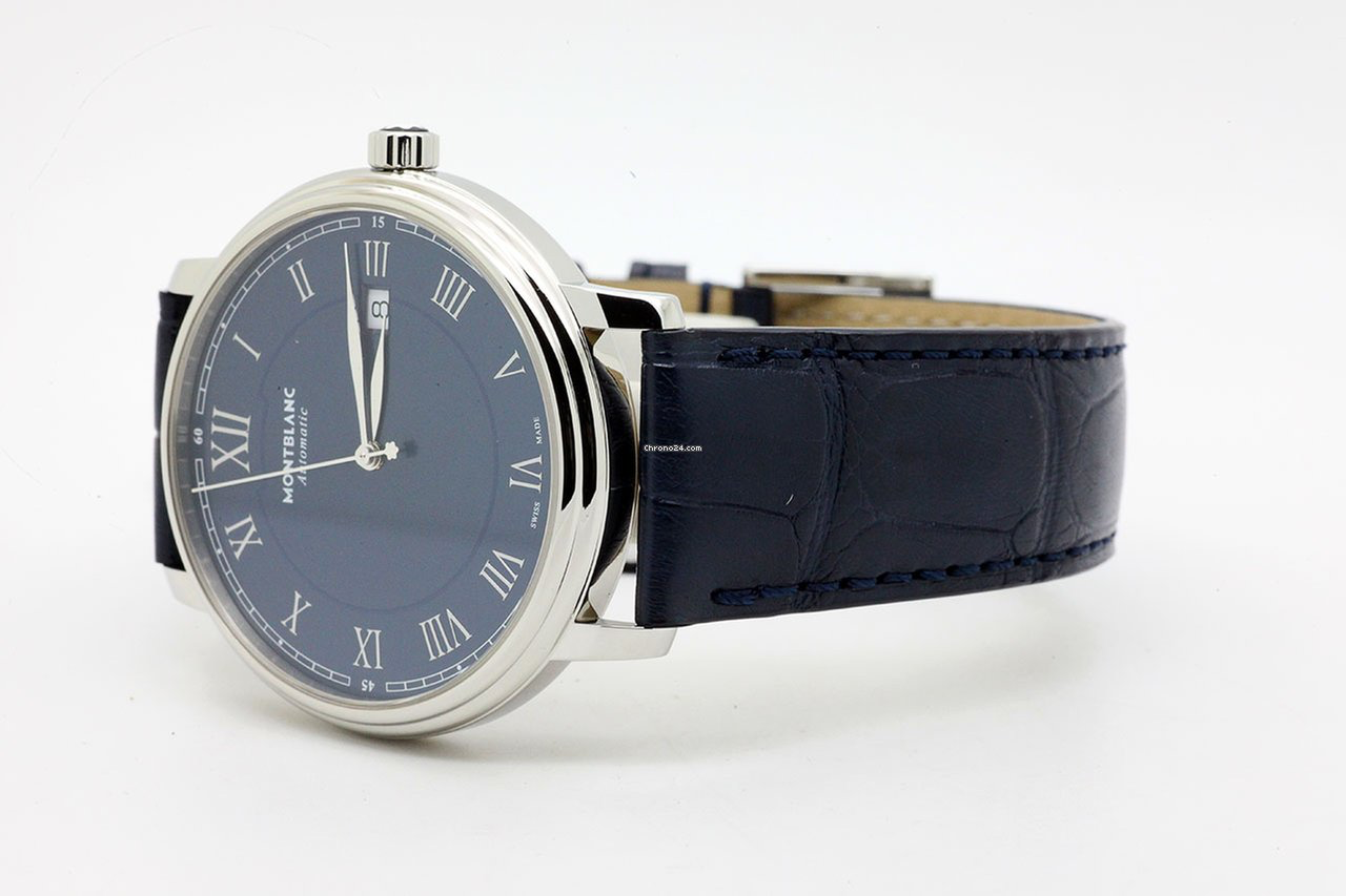 The Montblanc Tradition Date Automatic boasts both a distinctive Montblanc design expression as well as classic watchmaking codes. The stainless steel case features the typical Montblanc straight horns and a distinctive double-shaped bezel with domed sapphire glass. The design expresses classical watchmaking codes, such as the new blue dial with Roman numerals and a prominent Roman “XII”. The traditional railway minuterie and the classic leaf-shaped and baton-shaped hands complete this elegant appearance.
