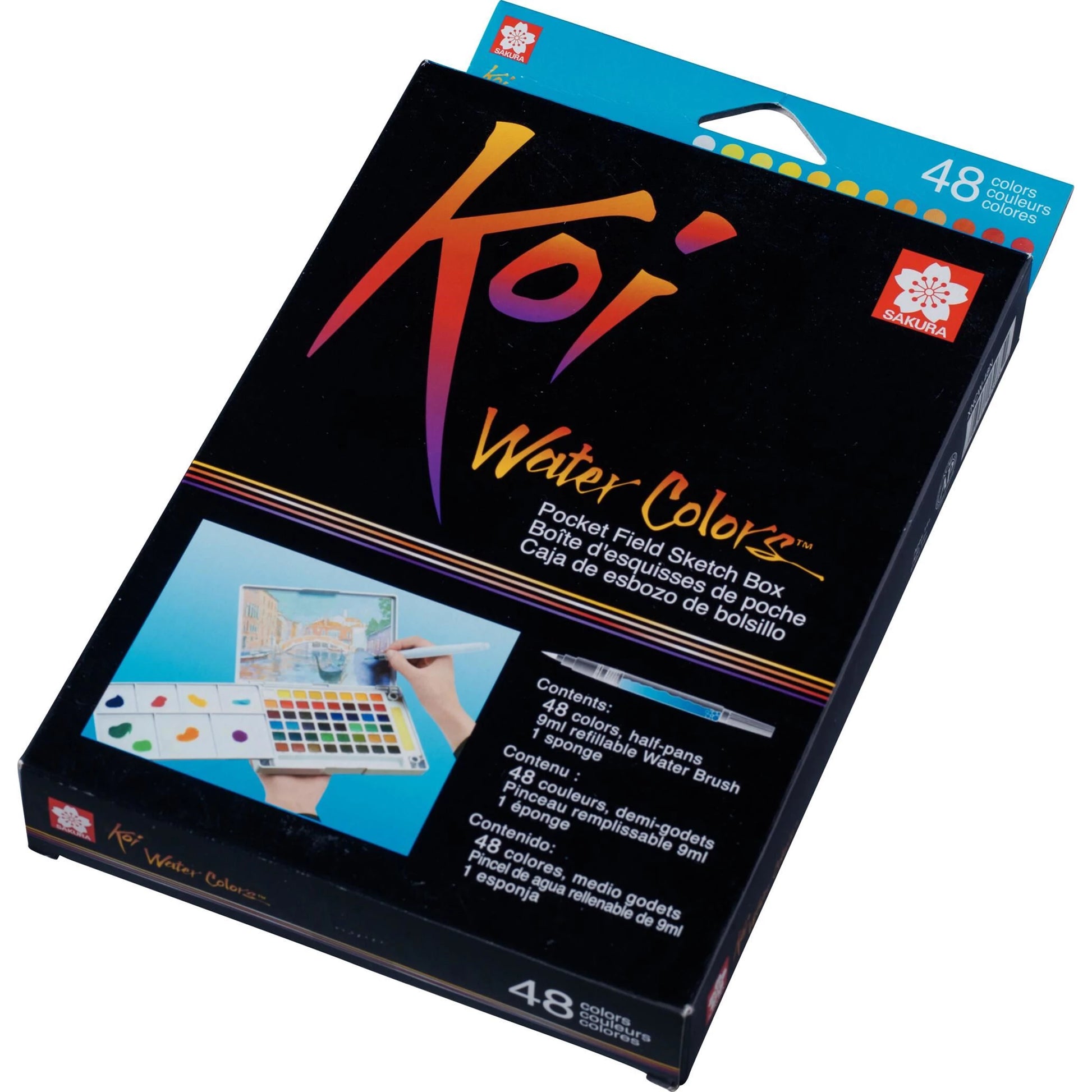 Koi Water Colors are fun and vivid watercolour paints to illustrate, decorate and create art with! This compact kit contains 48 vibrant watercolours and includes a mixing palette in the lid of the box, a sponge and a Koi Water Brush (brush with water tank).