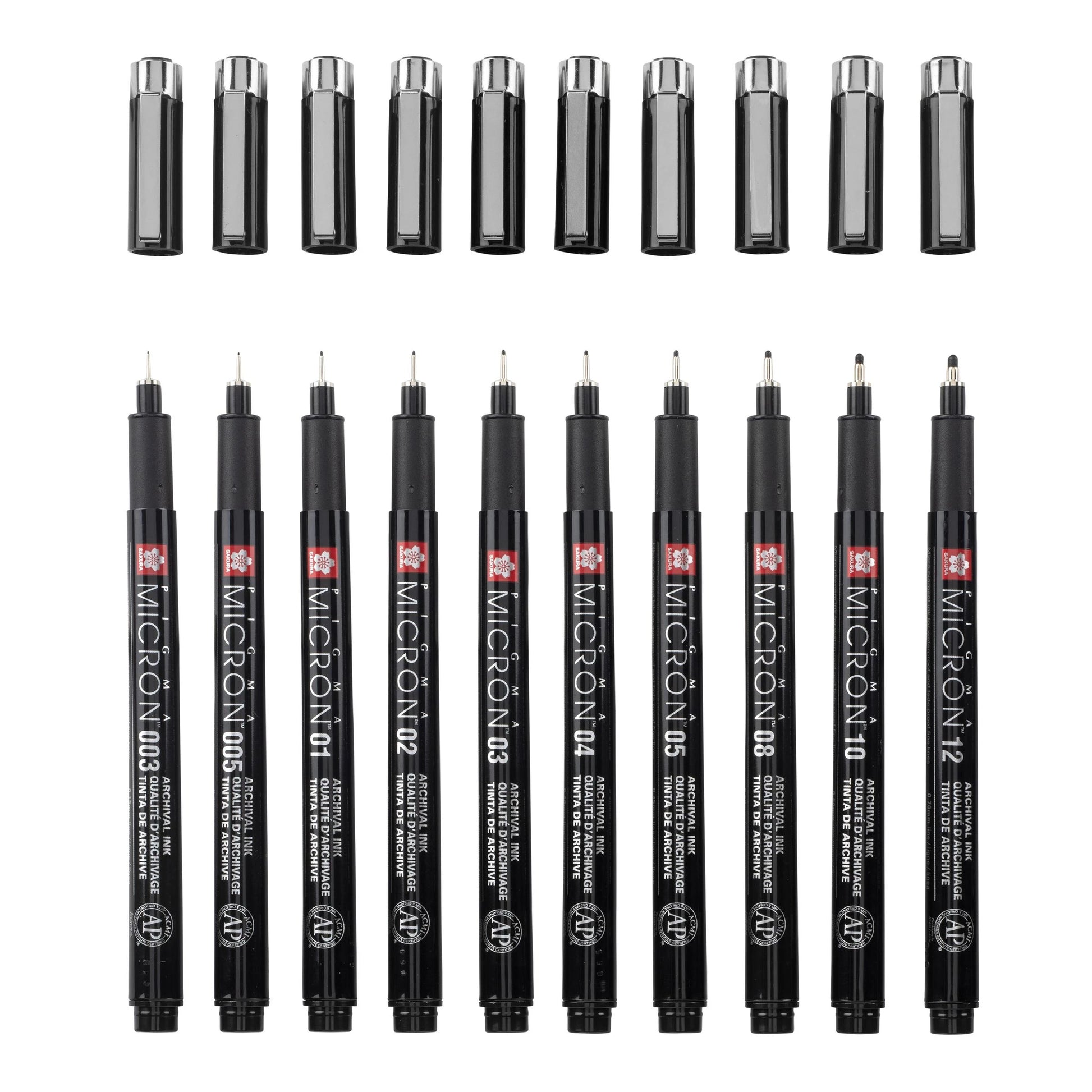 This set contains all 10 nib sizes: 1 x 003 (0.15 mm), 1 x 005 (0.2 mm), 1 x 01 (0.25 mm), 1 x 02 (0.30 mm), 1 x 03 (0.35 mm), 1 x 04 (0.40 mm), 1 x 05 (0.45 mm), 1 x 08 (0.50 mm), 1 x 10 (0.60 mm) and 1x 12 (0.70 mm).