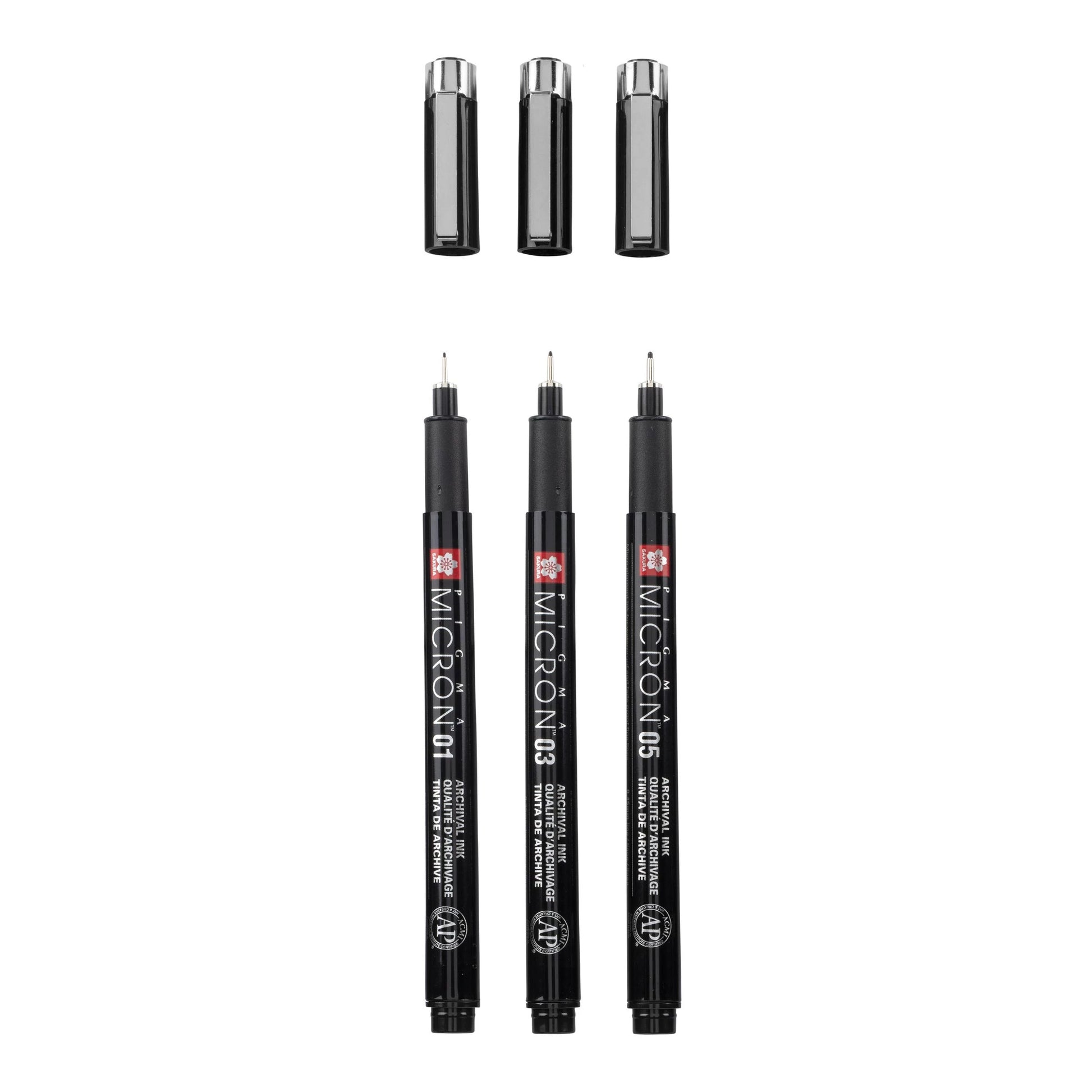 This set contains 3 Pigma Micron fineliners in nib sizes: 1 x 01 (0.25 mm), 1 x 03 (0.35 mm) and 1 x 05 (0.45 mm).