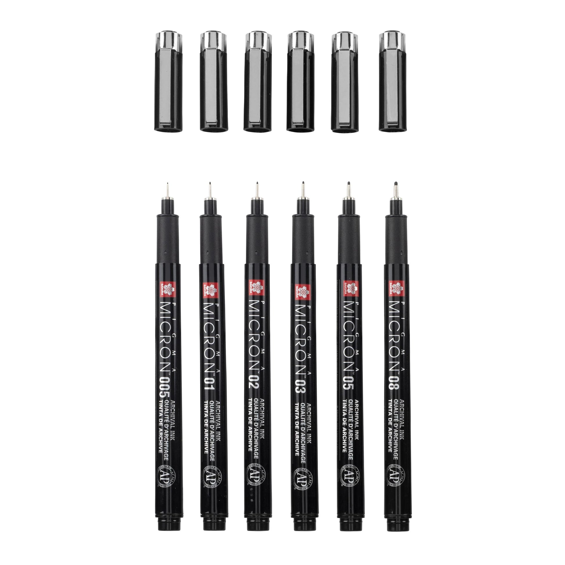 This set contains 6 fineliners in nib sizes: 1 x 005 (0.2 mm), 1 x 01 (0.25 mm), 1 x 02 (0.30 mm), 1 x 03 (0.35 mm), 1 x 05 (0.45 mm) and 1 x 08 (0.50 mm).