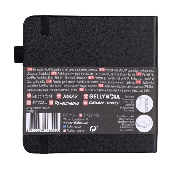 The Sakura Sketch – Note Book 12x12 cm with 80 crème-white sheets of 140 g/m2 acid free paper keeps all your ink, pencil, oil pastel or charcoal creations in one place. The exclusively illustrated sleeve can be used as a book mark. Art by: Marieke Sanchez. The hard cover book comes with a pen holder that perfectly fits pens such as the Pigma Micron and Sakura Gelly Roll. In the back of the Sketch – Note Book an expandable envelope is included for storing sketches and notes. The elastic closure band ensures the book stays closed and compact when travelling. Sakura Sketch – Note Books are perfect for sketching and writing with Sakura products: Pigma Micron, Pigma Brush, Koi Coloring Brush Pen, Gelly Roll, Permapaque and the original Cray-Pas. Sakura Sketch – Note Books are available in crème-white or black pages, in various sizes.