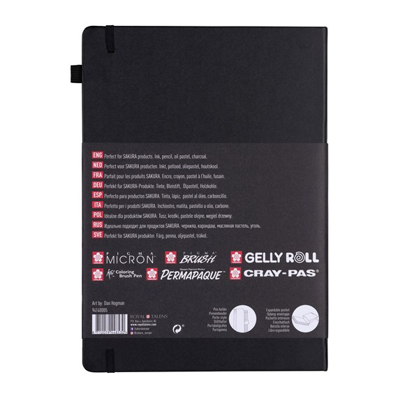 The Sakura Sketch – Note Book 21x29,7 cm with 80 black sheets of 140 g/m2 acid free paper keeps all your ink, pencil, oil pastel or charcoal creations in one place. The exclusively illustrated sleeve can be used as a book mark. Art by: Dan Hogman. The hard cover book comes with a pen holder that perfectly fits pens such as the Pigma Micron and Sakura Gelly Roll. In the back of the Sketch – Note Book an expandable envelope is included for storing sketches and notes. The elastic closure band ensures the book stays closed and compact when travelling. Sakura Sketch – Note Books are perfect for sketching and writing with Sakura products: Pigma Micron, Pigma Brush, Koi Coloring Brush Pen, Gelly Roll, Permapaque and the original Cray-Pas. Sakura Sketch – Note Books are available in crème-white or black pages, in various sizes.