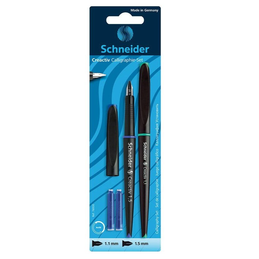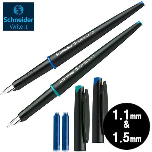 Calligraphy set · Content: 2 fountain pens, line width 1,1 and 1,5 mm each, 2 standard ink cartridges, royal blue, erasable · Creates impressive handwriting · Fountain pen with special angled nib without iridium tip