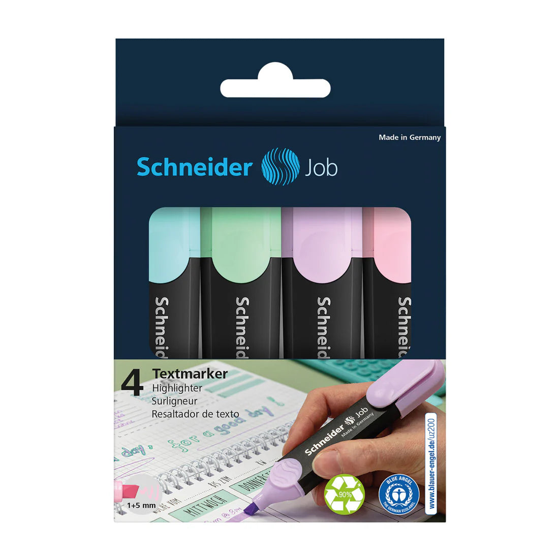 Highlighter with chisel tip for two line widths, 1+5 mm.Wallet with 4 pieces: each 1 x turquoise, mint, lavender, light pink. The universal ink presents maximum brilliance and good lightfastness on normal, copying, and fax paper. The anti-evaporation polypropylene barrel is guaranteed to keep the highlighter fresh for 2 years. The smart highlighter features brilliant performance and was awarded the renowned iF and red dot design awards in 2013. The slimmer shape with rounded edges is perfect for sticking in one's pocket or pencil case. The cap has a clip and fits neatly on the end of the barrel. With its large ink reservoir, the Job pen can highlight over 15,000 words.