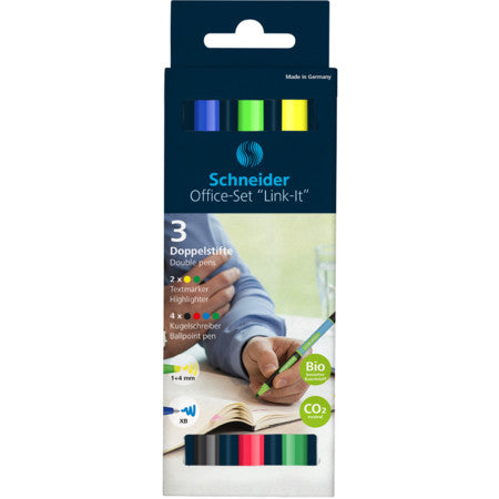 Whether office, university or school - with our office set Link-It you are well equipped. Depending on your needs, you can combine your own individual problem solver and connect two pens of your choice to form one pen. From now on, structure, plan and organize with ease, because you have the perfect 2-in-1 pen solution for every task and every appointment. Discover the variety and combine according to your own preferences: ballpoint sliders in the colors black, red, blue and green with line width XB and highlighters in the fluorescent colors yellow and green. The rubberized, ergonomic triangular shaft is comfortable and non-slip in the hand. Another perfect combination and therefore a big plus for our environment: The Link-It is manufactured CO2-neutral and its housing consists of over 85% bio-based plastic.