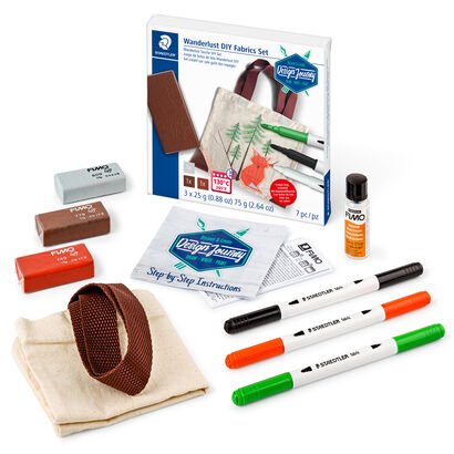 - Set with textile markers and oven bake modelling clay leather-effect for beautifying fabrics like cotton bags in the trendy wanderlust style